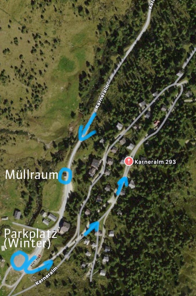 → A10 südlich folgen. Bei Ausfahrt 104- St. Michael im Lungau auf B96 in Richtung St. Michael im Lungau fahren. Der Straße auf B96 bis Tamsweg und dann weiter die B95 Richtung Murau folgen. Nach erreichen der Ortschaft „Ramingstein“ am Waagplatz (Gasthof Durigon) rechts in die Karneralmstrasse abbiegen und der bergaufführenden Straße 9km folgen. Am Ende der Straße (Parkplatz) geht links eine Schotterstraße (nur für Anrainer) weiter. Dieser lt. Plan folgen.
